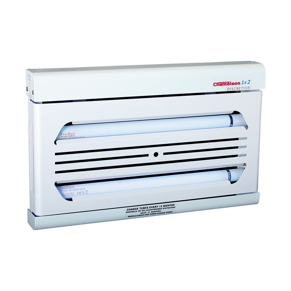 Diskretes und schlankes Wandgerät (auch als Standgerät verwendbar – Sonderausstattung). Eine attraktive Blende verbirgt die Klebefläche und den Insektenfang. Das Gerät ist dadurch ideal für Bereiche mit Publikumsverkehr. Dieses Chameleon 1x2 weist ähnliche Charakteristiken wie das Standard 1x2 auf, ist aber mit der zusätzlichen Diskretionsblende ausgerüstet.