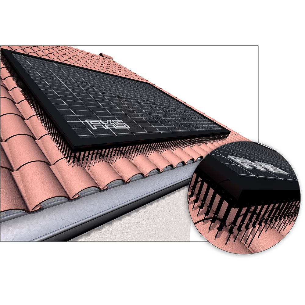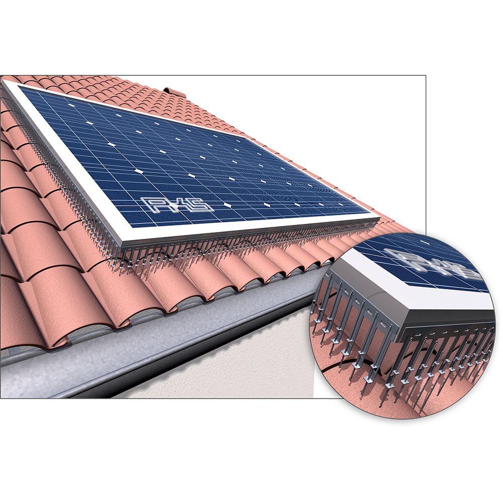 Die PV-Spikes sind speziell für die seitlich umlaufende Montage an Photovoltaik und Solarthermie-Panels konzipiert, um das Unterkriechen von Tauben unter die Panels zu verhindern. Tauben nutzen diesen Unterschlupf sehr häufig, um weitestgehend witterungsgeschützt einen Schlaf- oder Nistplatz einzurichten. Mit den PV-Spikes wird der Zugang wirksam verwehrt! Die senkrecht nach unten fallenden, selbstnivellierenden Spikes mit einer Höhe von 110 oder 170 mm Länge sind in einer Edelstahlhülse geführt.