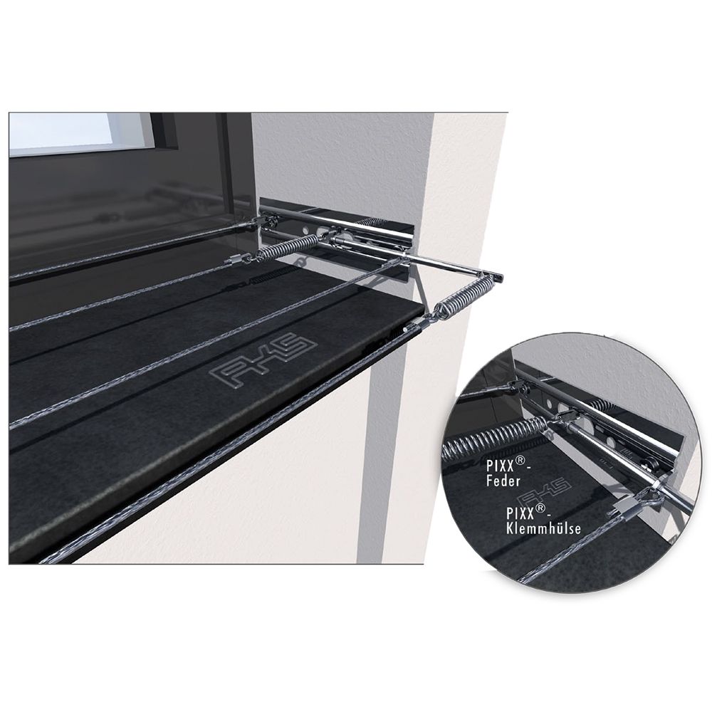 Durch Edelstahlseile, die mit Hilfe von Federn und Klemmhülsen an den Trägerelementen gespannt werden, wird das Absitzen der Tauben wirksam verhindert. Durch einen optional eingeschraubten Einzelpin kann auch der ausragende Bereich des Gesimses geschützt werden.